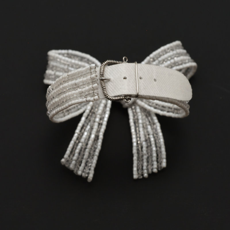 一つ一つのカットの美しい小さなグラスビーズを贅沢に敷き詰めた、アシンメトリーが印象的な白いストライプのリボンチョーカーのセットです。