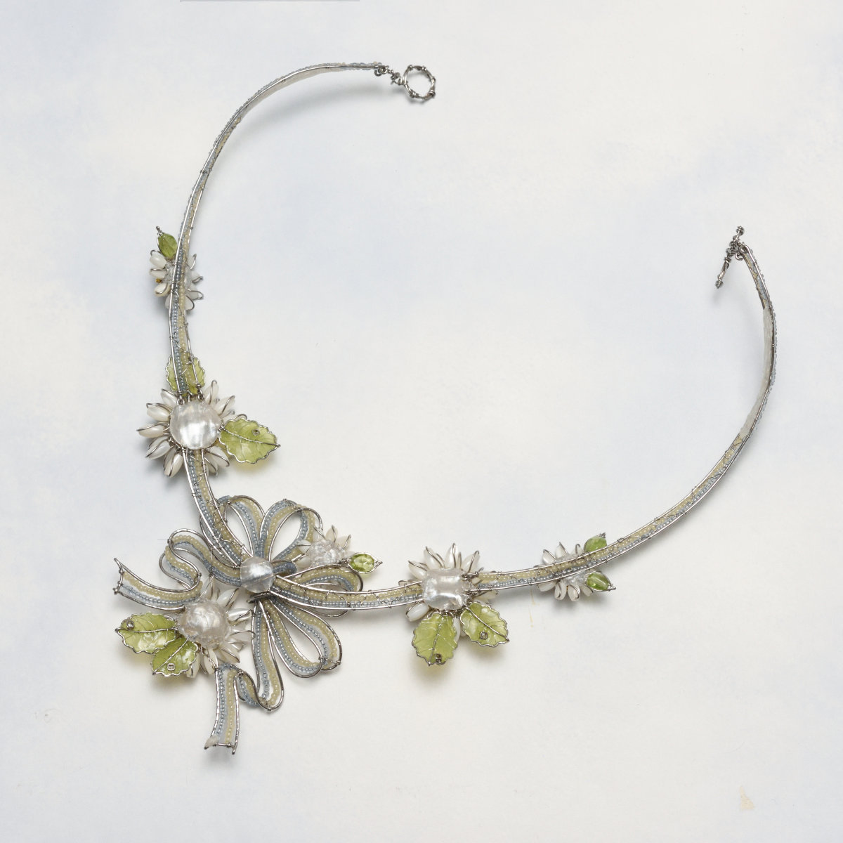 マザーオブパールの花びらと、フランスのアンティークビーズが連なるリボン。優しい色合いが絶妙なハーモニーを奏でる、可憐でロマンチックなセットです。