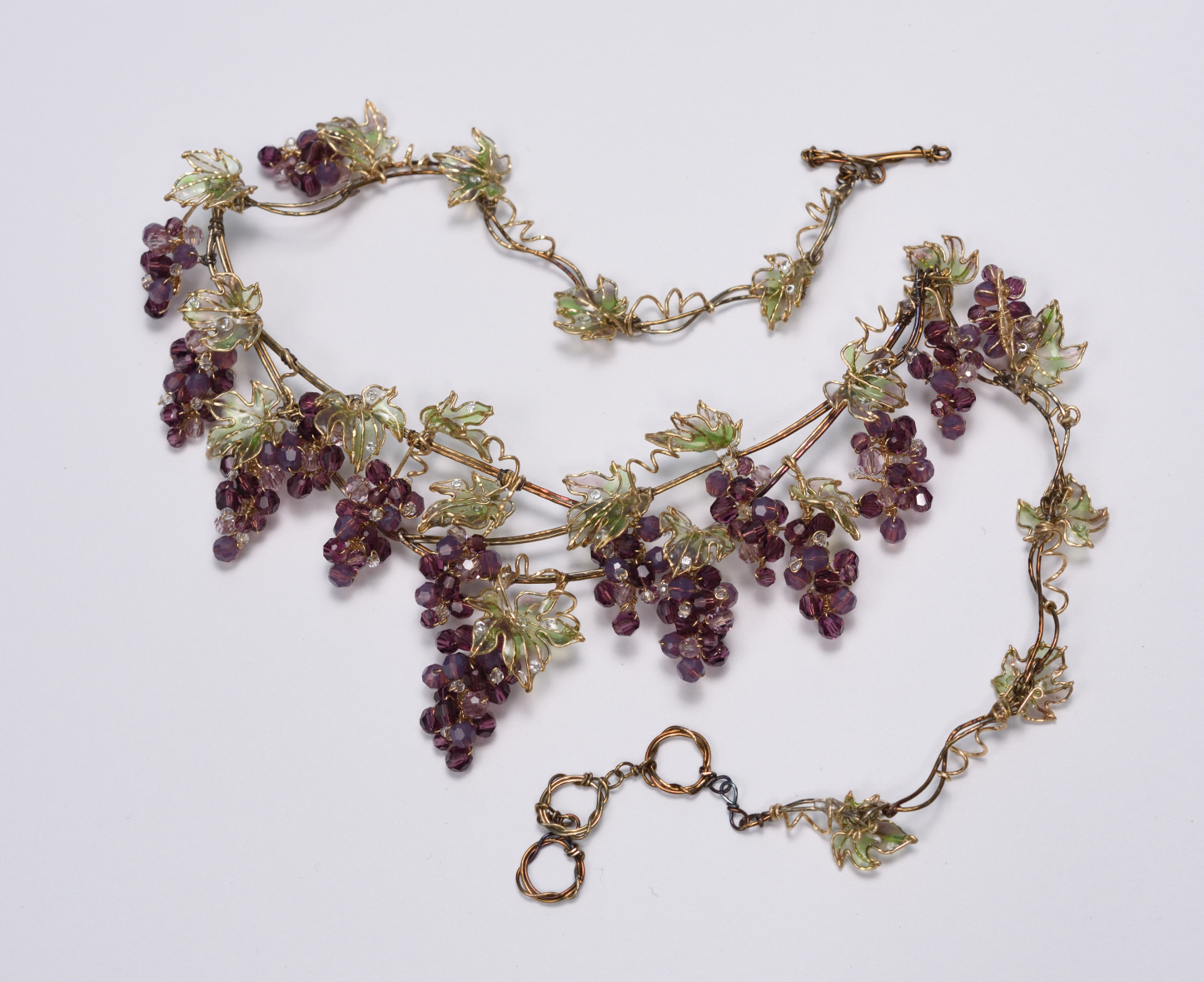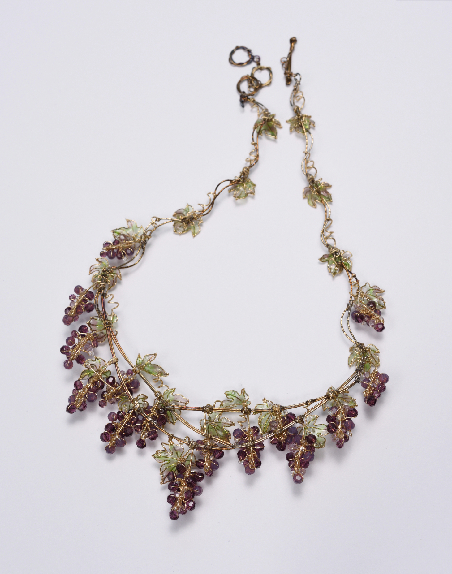 たわわに実る葡萄の木をイメージしたネックレス。カットグラスビーズの実とジルコニアの水滴がキラキラ輝きます。