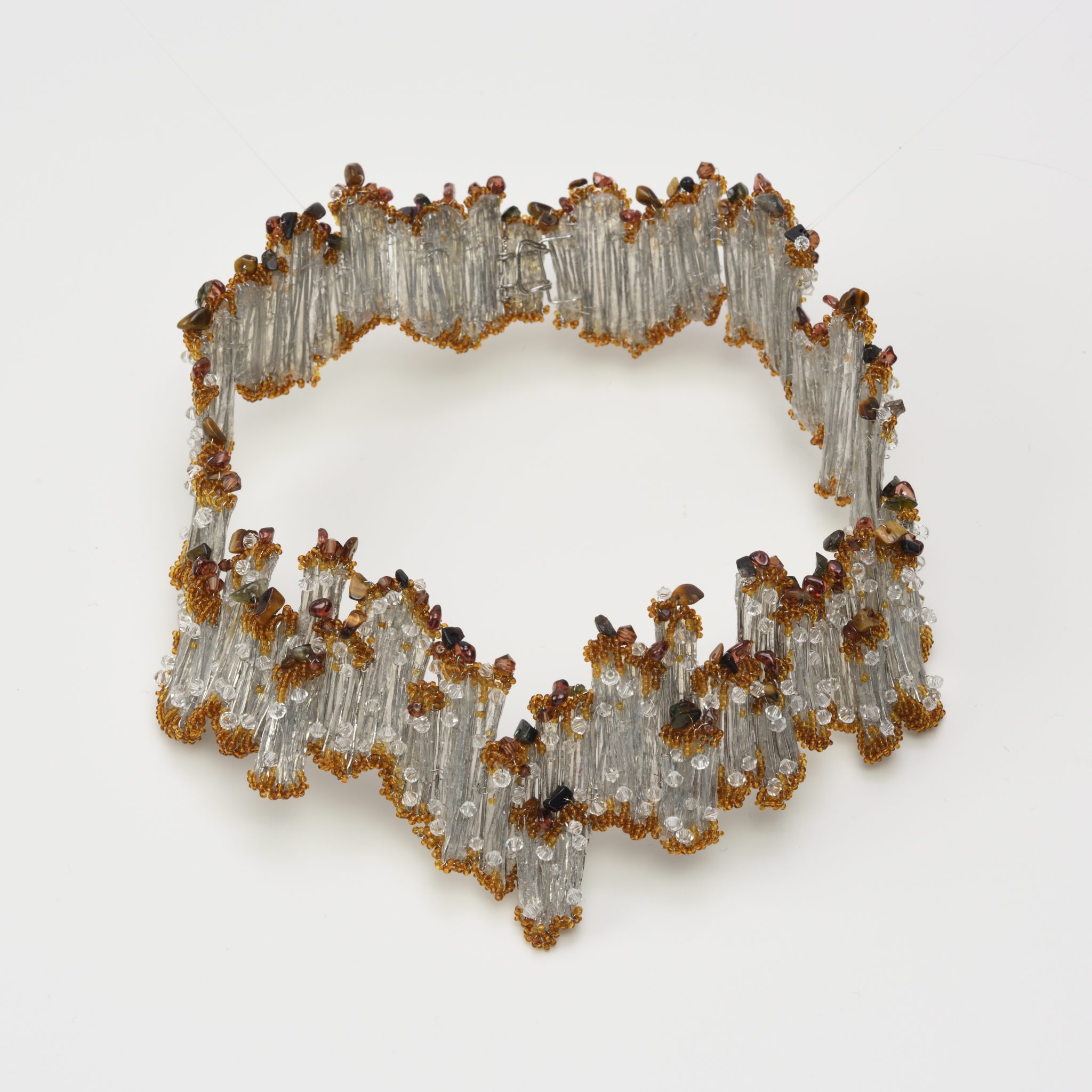 一つ一つ手作業で輝きを与えたワイヤーでシュッと伸びた霜柱を、極小ビーズで盛り上がった土を、カットグラスビーズで朝露の輝きを表現したチョーカーです。